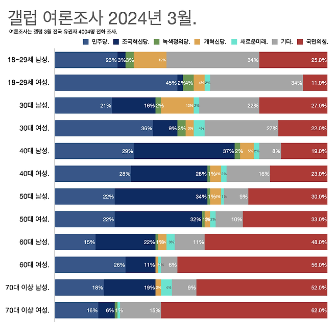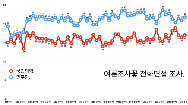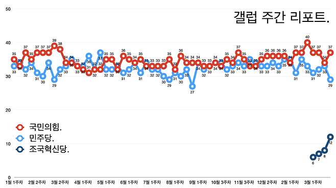 반면 갤럽 여론조사에서는 2월 마지막주까지 국민의힘이 40%로 압도적인 1위를 기록했다. 민주당은 33%에 그쳤는데 3월 들어 민주당과 조국혁신당의 합산 지지율이 국민의힘을 따라잡기 시작했다.