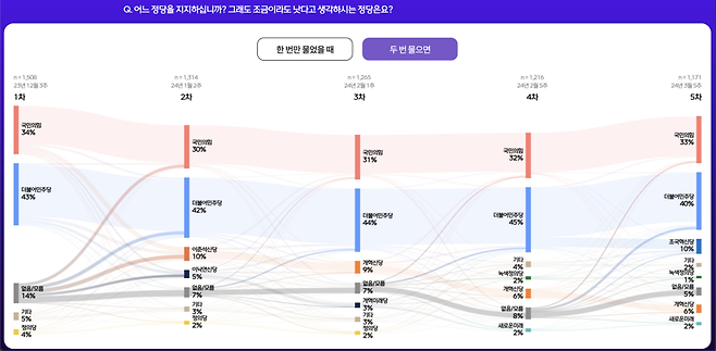 김어준도 강조했지만 MBC 패널 조사가 비교적 여론조사꽃과 비슷한 추세를 보였다. 패널 조사는 같은 패널을 반복해서 조사하기 때문에 표본 오류가 더 적다는 평가를 받는다. 5차례에 걸쳐 진행한 MBC 패널 조사는 민주당 지지율이 1월과 2월에도 꾸준히 40%대를 유지했다는 사실을 확인할 수 있다.