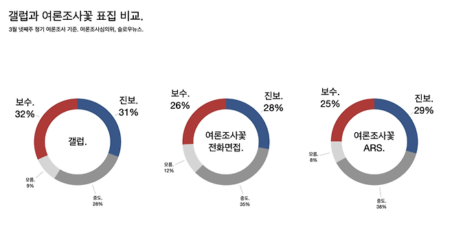 갤럽 여론조사를 비판할 때 흔히 하는 말이 보수가 과표집됐다는 것이다. 실제로 3월 넷째주 전국 조사를 비교해 보면 갤럽은 전체 1001명 가운데 보수가 317명, 진보가 306명인데 여론조사꽃은 보수가 261명, 진보가 278명이다. 미묘하게 갤럽은 보수가 많고 여론조사꽃은 진보가 많다. 중도 비율도 다르다. 갤럽은 281명이고 여론조사꽃은 350명이다. ‘약간 보수적’과 ‘약간 진보적’을 보기에 넣어 중도가 줄었을 가능성이 있다.