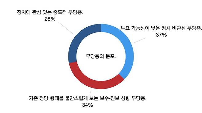 갤럽 분석에 따르면 투표 가능성이 낮은 정치 비관심 무당층이 37%, 기존 정당 행태를 불만스럽게 보는 보수 또는 진보 성향 무당층이 34%, 정치에 관심 있는 중도적 무당층이 28%의 비율로 나뉜다.
