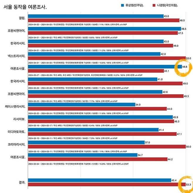 22대 총선 서울 동작을 여론조사와 실제 투표 결과 비교. 대부분 여론조사에서 국민의힘이 이기는 걸로 나왔고 실제로 나경원이 당선됐다. 여론조사꽃은 3월 마지막주 조사에서 민주당 후보가 5.7%포인트 차이로 앞섰다고 했지만 여전히 오차범위 안이었다.
