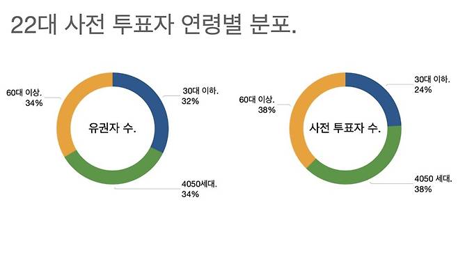 30대 이하는 유권자수 비중이 32%인데 사전 투표자 비중은 24% 밖에 안 된다. 아직 본 투표 연령대별 비중은 공개되지 않았지만 2030 유권자들의 낮은 투표율이 결정적인 변수였을 수도 있다.