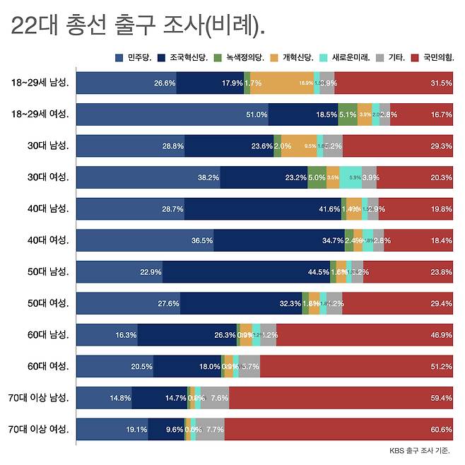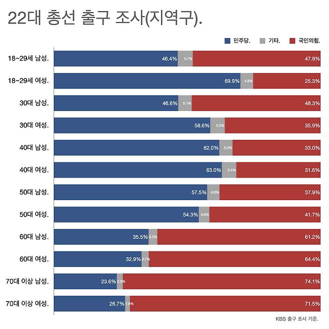 다음 그림은 방송 3사 출구 조사 가운데 연령대별 득표율을 비교한 것이다. 20대 남성과 20대 여성의 격차가 크다. 이대녀가 투표소에 많이 가면 민주당이 유리하고 이대남은 안 가는 게 유리하다. 국민의힘은 그 반대다. 연령대별 투표 참여 의사 등을 제대로 분석한 조사가 없다.
