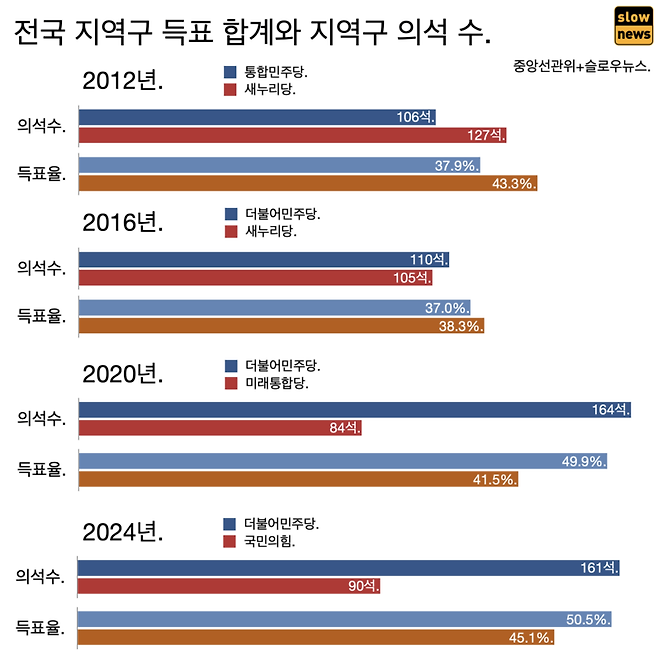 2012년 이후 수도권에서 민주당 강세 경향이 굳어지면서 국민의힘 계열 보수 정당이 불리한 상황이 됐다. 국민의힘은 올해 수도권에서 43.7%의 득표율을 기록했지만 122석 가운데 19석밖에 못 챙겼다. 비율로는 17%가 채 안 된다.