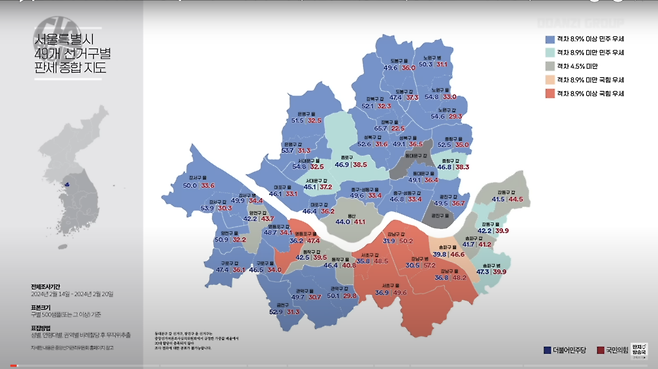3월6일 다스뵈이다 방송 갈무리. 강남 3구와 영등포을을 제외한 대부분의 선거구에서 민주당이 이기는 것으로 나왔다.