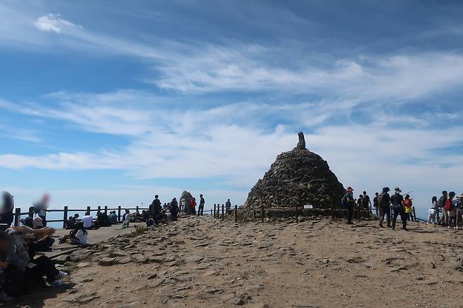 정상은 생태 보호를 위해 울타리로 통제되고 대신 전망대에서 지리산 능선을 감상할 수 있습니다. 맑은 날이라면 남쪽으로는 하동과 남해 바다북쪽으로는 반야봉과 천왕봉이 한눈에 들어와 시원한 조망을 선사합니다.