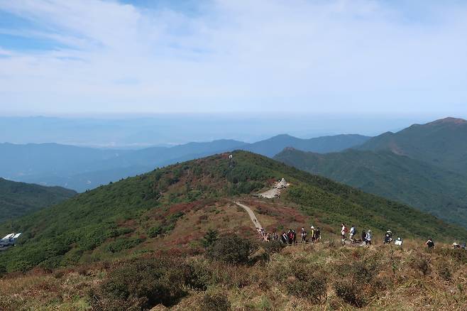대피소 이후부터는 경사가 조금 더 두드러지지만 짧아 큰 어려움은 없습니다. 오르막 구간을 지나면 곧바로 넓게 트인 노고단 정상부의 초원지형이 발아래 펼쳐집니다.
