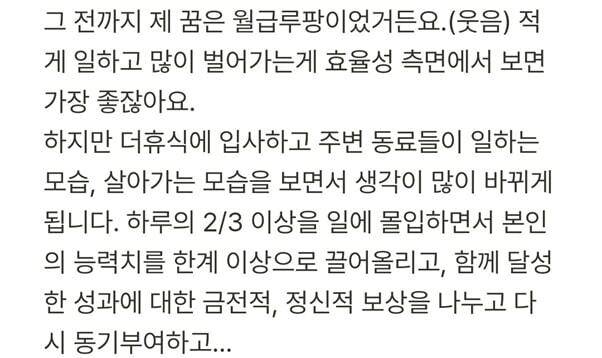 신현욱: 저는 성장 없는 기업이 그렇게 좋은 회사라고 생각하지 않습니다. 작은 시장에서 높은 영업이익을 올리는 것도, 사장이나 임원급에게는 충분히 괜찮겠죠. 하지만 전 기존의 인력들이 더 성장하고, 더 좋은 인재를 고용하고, 그렇게 더 큰 사업을 하고, 이런 선순환 구조를 그리는 자체가 재밌어요.