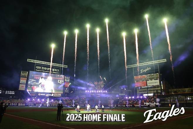 한화는 지난달 30일 대전 한화생명 볼파크에서 열린 2025 신한 SOL 뱅크 KBO리그 홈 경기에서 연장 10회말 루이스 리베라토의 끝내기 안타로 롯데 자이언츠를 1-0으로 누르고 밤하늘을 불꽃으로 수놓았다.