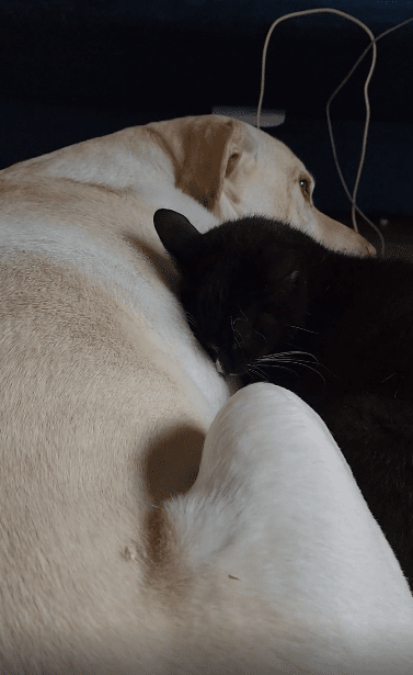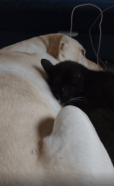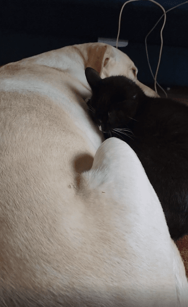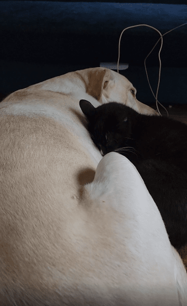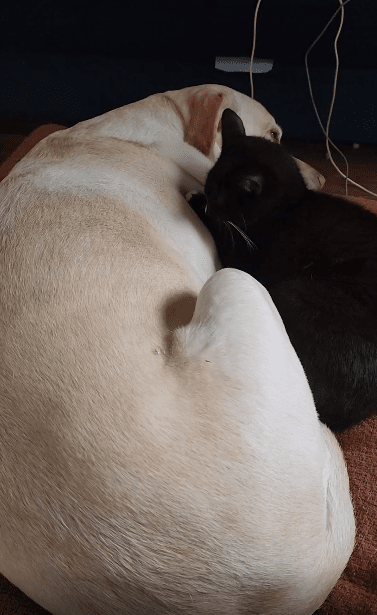 출처 : Reddit / 하얀 강아지가 편하게 누워있고 그옆에 검은 고양이가 강아지에게 살짝 기댄체 누워있다