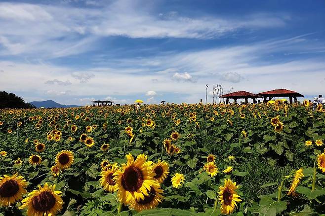 약 42,500㎡(약 11,000평)에 달하는 광활한 면적을 가득 채운 해바라기는 보고만 있어도 감탄이 자동적으로 나오며, 특히 강주리 주변에 펼쳐지는 해바라기 군락은 한 폭의 그림같습니다.