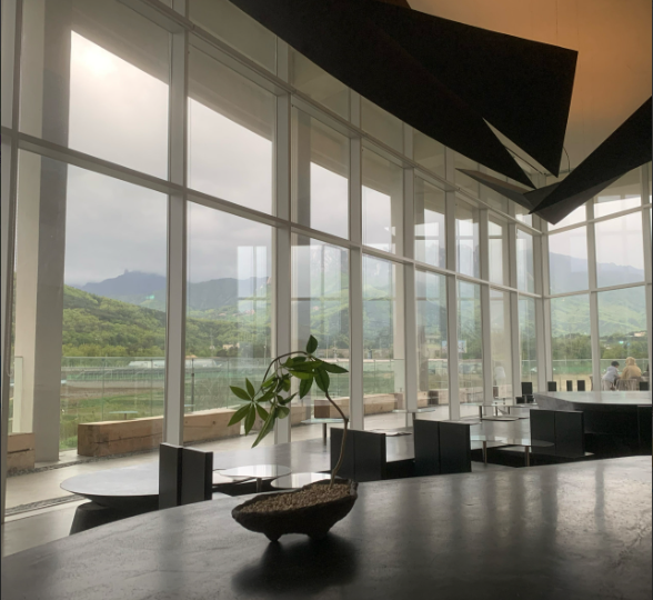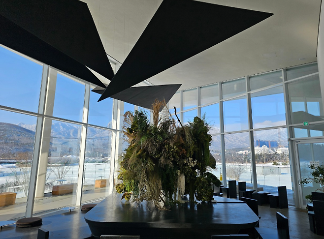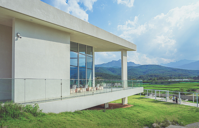 야외 좌석도 넓게 조성, 앞쪽은 물 정원, 뒤쪽은 탁 트인 산 전망