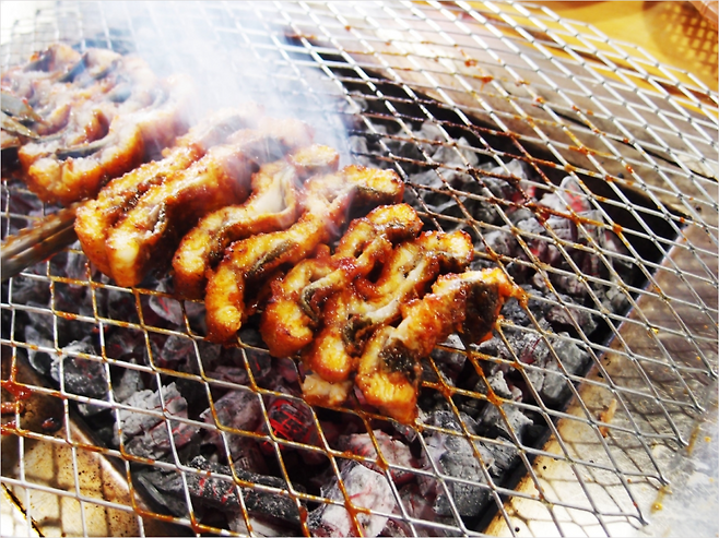 이곳의 하이라이트는 단연 대물 장어 소금구이. 숯불 위에서 정성스레 구워낸 장어는 그 자체로 예술이에요. 입에 넣는 순간 느껴지는 ‘겉바속촉’의 진수. 장어 특유의 감칠맛과 부드러운 육질이 입안 가득 풍미를 퍼뜨립니다.