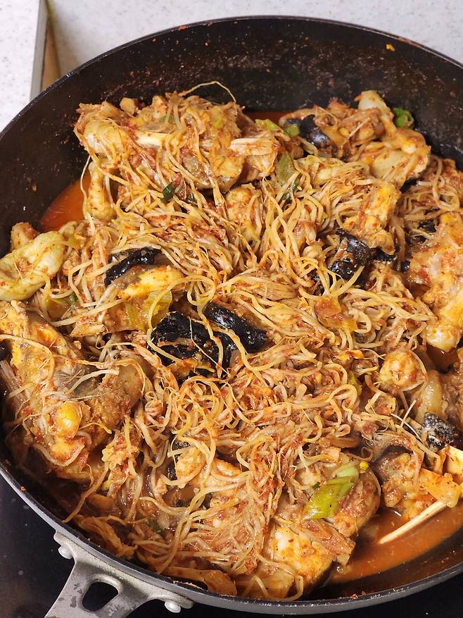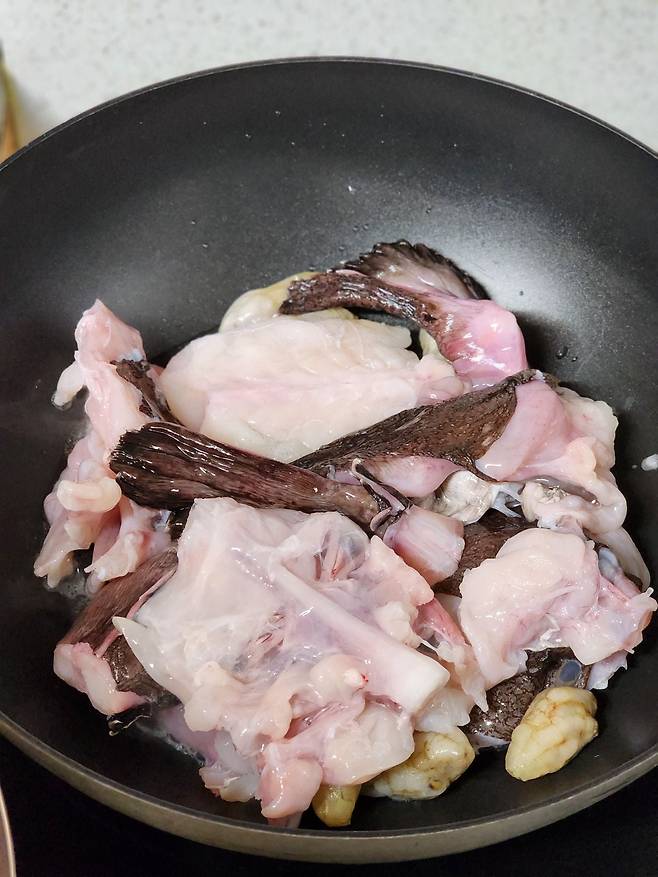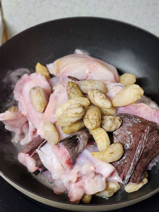 식용유를 두르고 아귀를 먼저 넣어 주고,