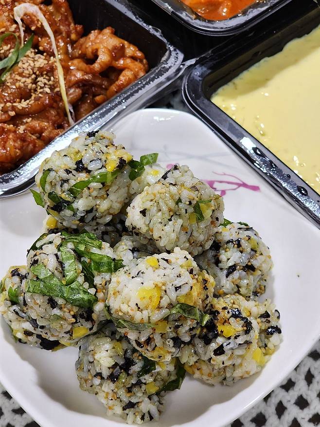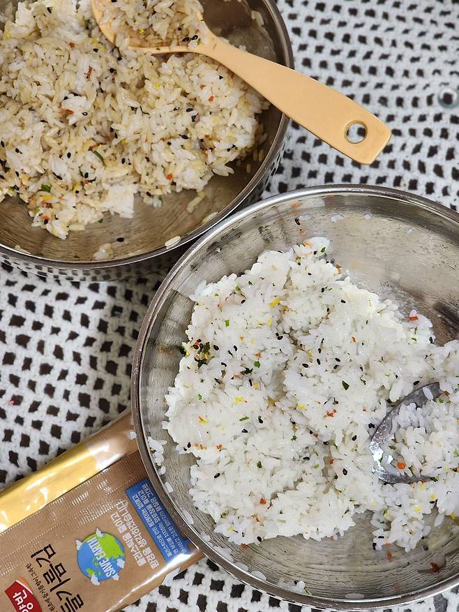 왜 밥이 서로 다르냐고요? 1+1 교차 구매...서로 다른 맛으로 골라 왔어요.