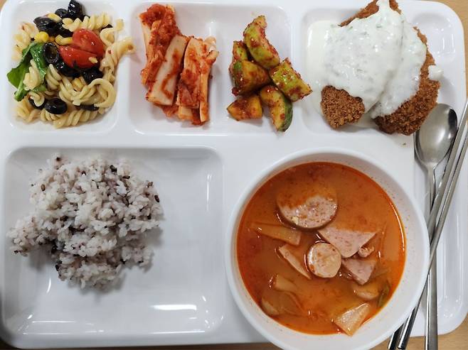 구내식당 점심도 한 번 올려봅니다. 일하는 중에는 많이 먹지 않아요.