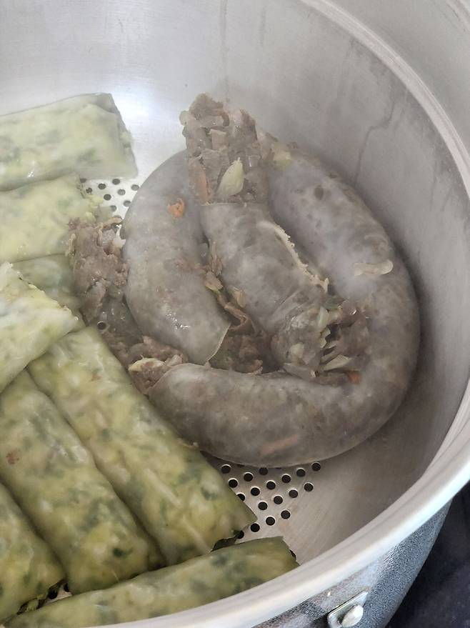 익은 순대를 썰며 기술 부족은 탓하지 않고, '칼이 잘 안 드네' 하면서 도구 탓을 해봅니다.