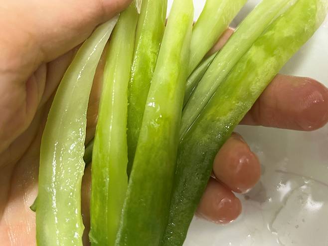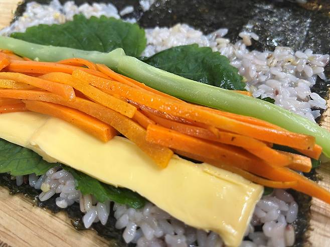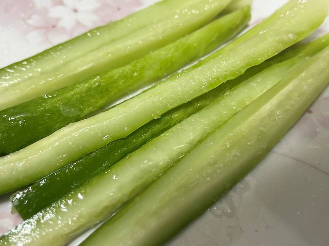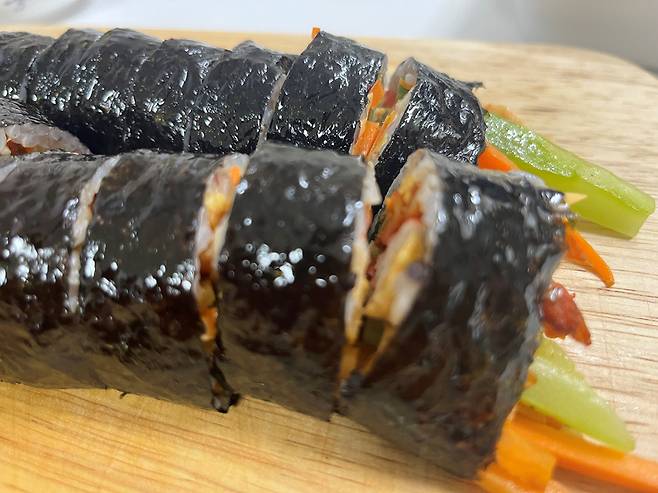 바로 "오이"인데요. 오이를 절여서 물기를 제거하면 단무지와 비슷한 아삭한 식감을 낼 수 있습니다. 또한 오이 특유의 꼬들꼬들함까지 더해져 훨씬 맛있는 김밥이 됩니다.
