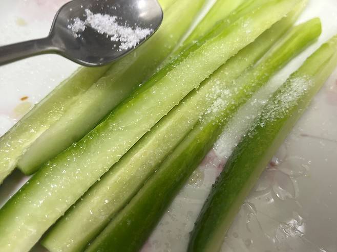 오이는 속을 파낸 후 길쭉한 모양으로 자르세요. 단무지 두께와 비슷하게 자릅니다. 그다음 소금을 커피스푼 1개 넣은 후 전체적으로 조물조물하여 15분 절입니다.