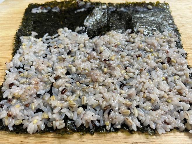 소금과 참기름으로 밑간 한 밥을 김에 얇게 펼쳐서 깔아줍니다.