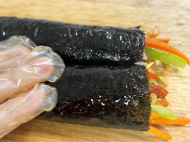 김밥을 싼 후 참기름을 김에 듬뿍 발라 고소한 풍미를 냅니다.