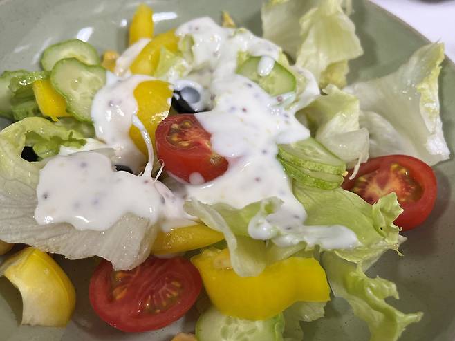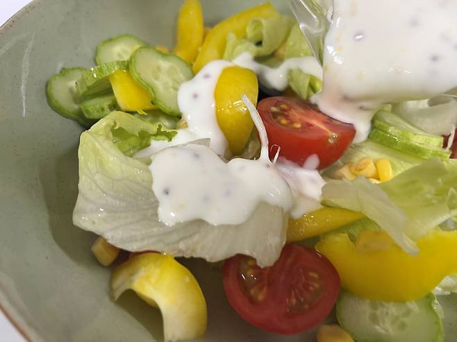 모든 재료를 잘 섞어서 드레싱을 만들어 줍니다. 요거트로 만들었지만 생각보다 느끼하지 않고, 맛의 균형이 좋아서 놀랐습니다.