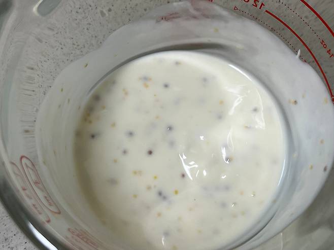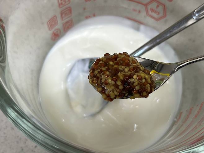 홀그레인머스터드도 1 커피스푼 넣습니다. 홀그레인머스터드는 거의 모든 샐러드 드레싱에 들어가는데요. 이것을 요거트처럼 부드러운 재료에 섞으면 밋밋함을 잡아주고, 감칠맛과 향을 확 끌어올리는 역할을 합니다.