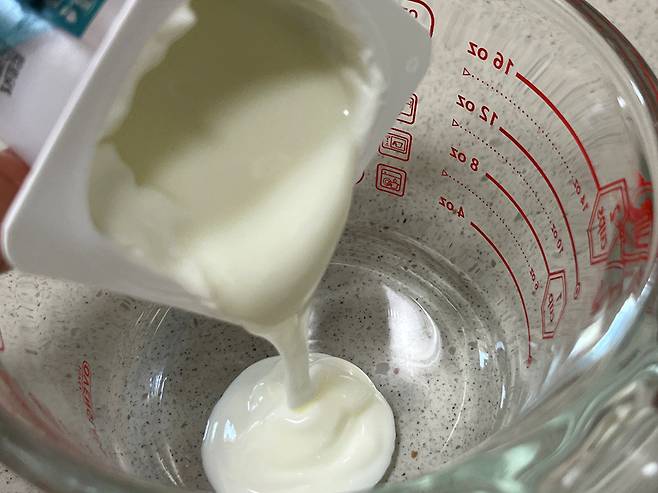 플레인요거트 작은 것 1통(85g)을 소스볼에 부어 줍니다. 드레싱을 만들 때는 너무 꾸덕한 제형의 요거트보다는 살짝 흐르는 느낌의 요거트를 사용해야 만들기 쉽습니다.