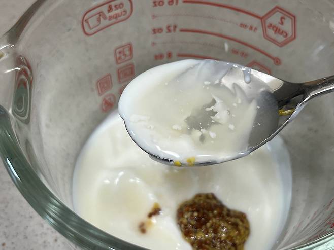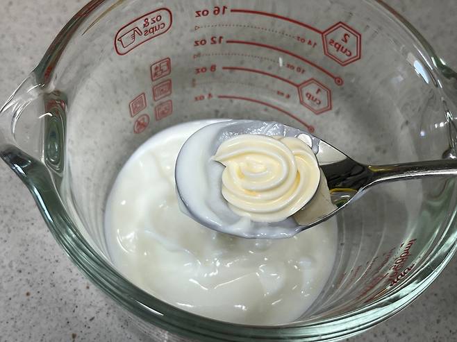 마요네즈를 커피스푼 1개 넣습니다. 요거트는 상큼, 산뜻한 맛이 강하기 때문에 고소한 마요네즈를 넣어 부드러운 맛을 더해줍니다.
