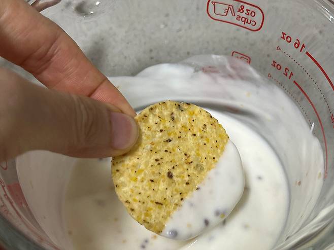나초칩을 찍어 먹어도 은근히 잘 어울리더라고요. 드레싱뿐 아니라, 랩이나 또띠아 쌀 때 소스로 활용해도 좋을 것 같습니다.