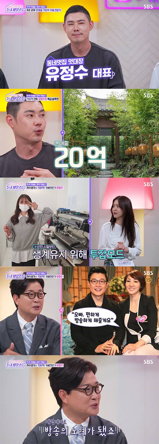 "요즘 브랜드당 15억 이상 매출이다"라는 김성주의 말에 유정수는 "브랜드는 30개 정도 가지고 있다"면서 "매장당 연매출이 15억이다. 매장은 60개 정도 있다"고 밝혔다. 또한 가장 많은 카페 매출에 대해 묻자, "익선동의 매장이 연 매출 20억 정도 나오고 있다. 18평 매장에서 15억 원 매출이 나오는데도 있다"고 공개했다.