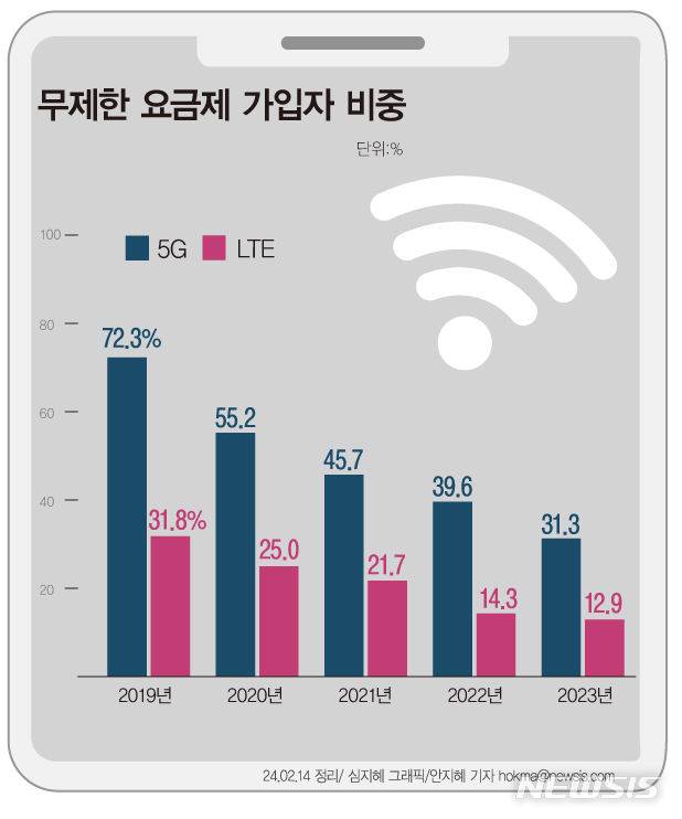 [서울=뉴시스] 심지혜 기자 = 5G 데이터 완전 무제한 요금제 가입자 비중이 계속 줄어들고 있다. SK텔레콤, KT, LG유플러스가 5G 요금제 구간 세분화를 지속하면서 무제한보다 사용량에 맞는 요금제로 이동한 것으로 보인다.