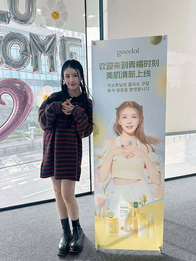 배경에 더해진 실버풍선과 하트 풍선, 그리고 봄 햇살이 드는 밝은 유리창 공간은 전체적인 분위기를 더욱 따뜻하게 만들어줬다. 별다른 연출 없이도 조화롭게 어우러지는 차오루의 스타일은, 계절감과 분위기를 동시에 살릴 수 있는 셀카 연출의 좋은 예시다.