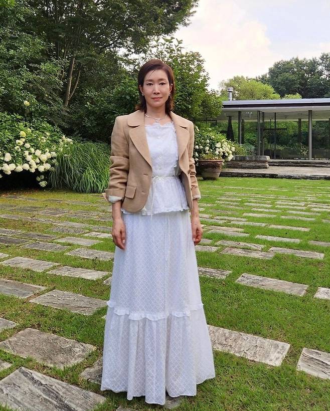 나영희는 화이트 레이스 원피스를 착용해 청순하고 우아한 자태를 뽐냈습니다.