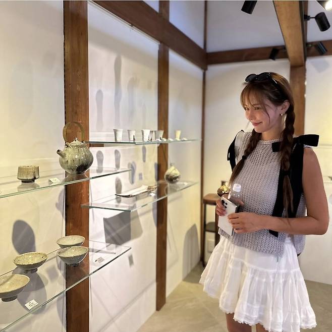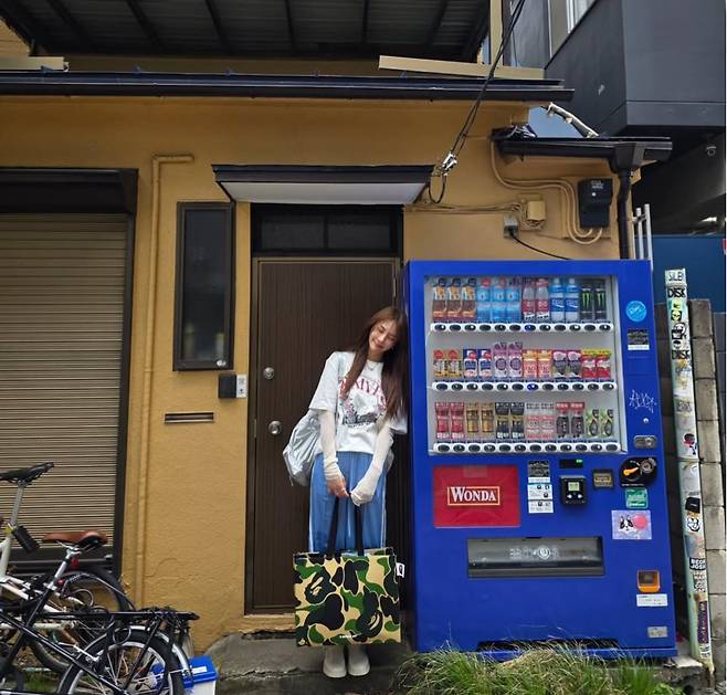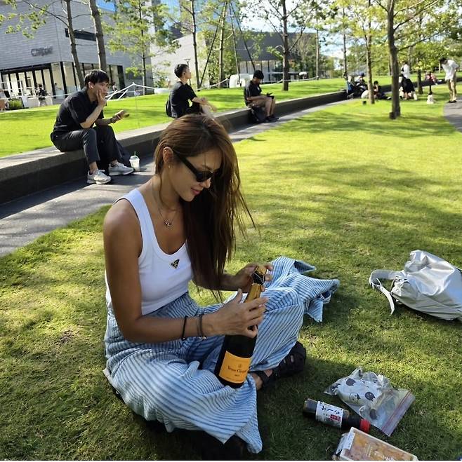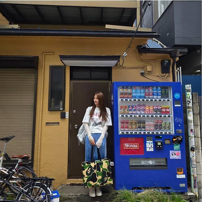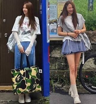 유하나는 화이트 티셔츠를 베이스로 한 캐주얼룩을 선보이며 편안하면서도 청량한 분위기를 연출했습니다.
