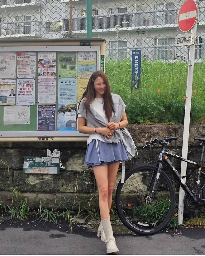 짧은 플리츠 미니스커트를 매치해 발랄한 소녀미를 강조했습니다. 여기에 그레이 니트를 어깨에 걸쳐 내추럴한 감각을 더했습니다.