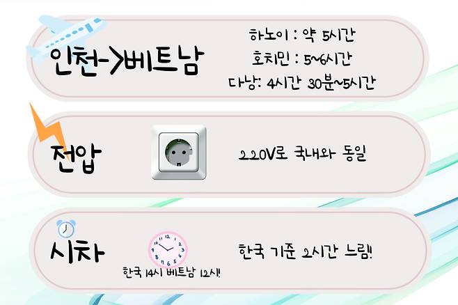 베트남 여행이 정말 익숙하게 다가와서 그렇지만, 실제 베트남 여행까지의 여정은 그리 쉽지 않습니다. 약 5시간 정도의 비행을 하기 때문이죠. 시차도 한국과 비교하면 2시간 정도 느립니다. 한국에서 오후 2시라면, 베트남은 정오라고 생각하면 됩니다.
