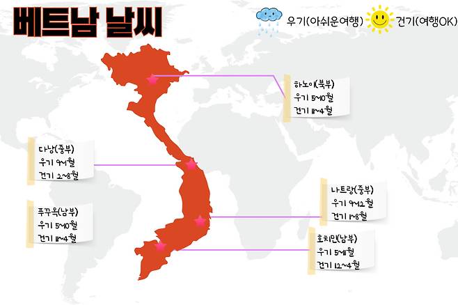 위 표를 참고하여 건기 시즌에 잘 맞춰서 베트남 여행을 계획해 보세요. 특히 우기 시즌에 가야한다면 우비는 필수입니다. 또한, 건기 시즌에 북부 지역 여행 시 예상 보다 쌀쌀할 수 있으므로 얇은 패딩이나 가디건을 준비하면 좋습니다.