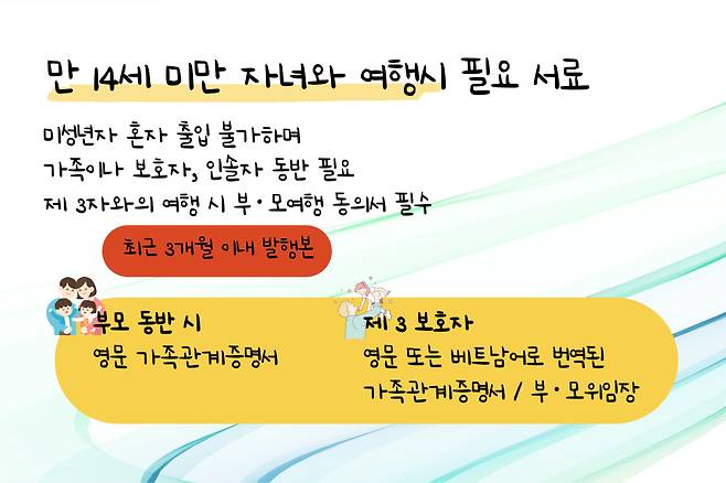 만 14세 미만 자녀들과 함께 베트남 여행을 떠나고 싶은 가족분들은 주목. 당연하게도 미성년자 혼자 베트남 여행은 불가하며 가족이나 보호자, 인솔자 동반이 필요합니다.