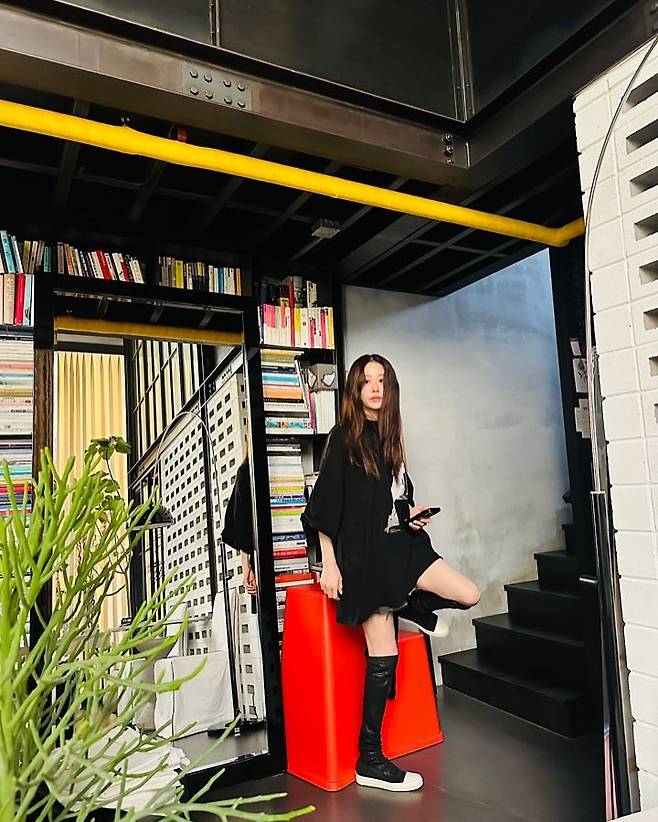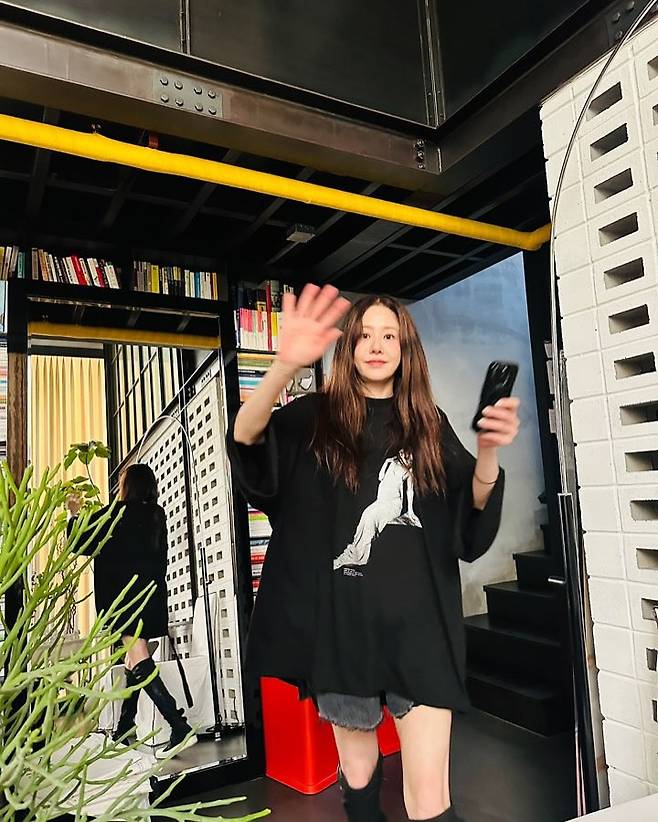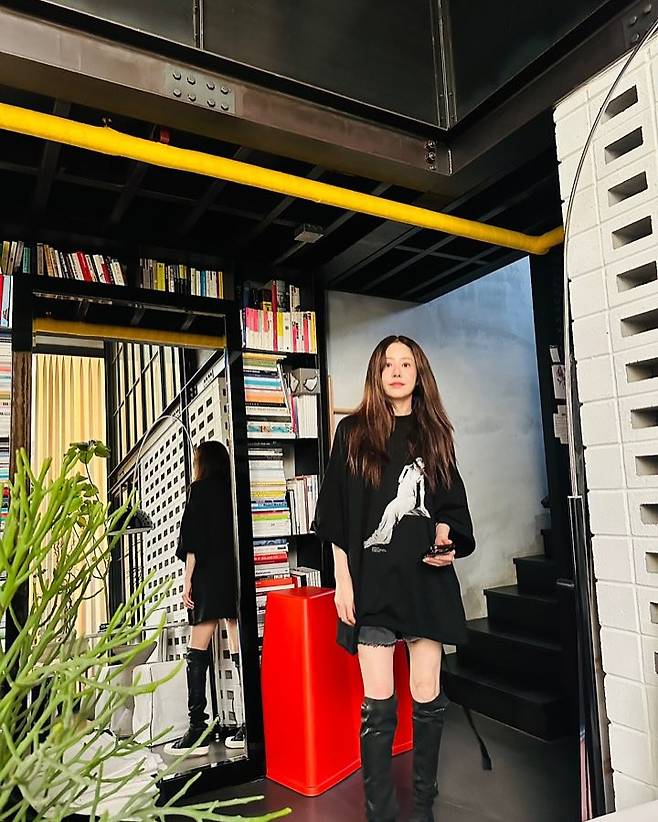 사진 속 고현정은 프린팅이 들어간 오버핏 블랙 티셔츠에 무릎 위까지 오는 롱부츠를 매치한 스타일링으로 힙한 매력을 발산했다.