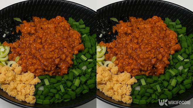 김 가루와 새우깡은 시간이 지나면 눅눅해져 식감이 줄어 면과 비비기 직전에 올리는 게 좋다. 달걀노른자는 숟가락으로 먼저 터트린 뒤 전체적으로 비벼줘야 양념이 부드럽게 퍼진다. 청양고추나 쪽파를 곁들이면 매운맛을 살릴 수 있다. 남은 양념은 밥에 비벼 먹기에도 잘 어울린다. 기호에 따라 가다랑어포, 잘게 썬 김치, 고명으로 고추냉이 소량을 더해도 어울린다.