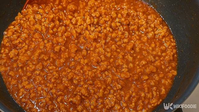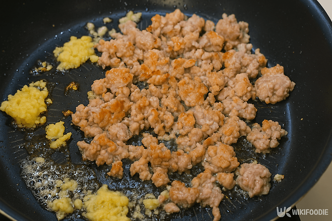 여기에 다진 돼지고기 150g을 넣고 고기의 핏기가 없어질 때까지만 볶는다. 센불이 아닌 중불에서 볶아야 육즙이 잘 유지된다.