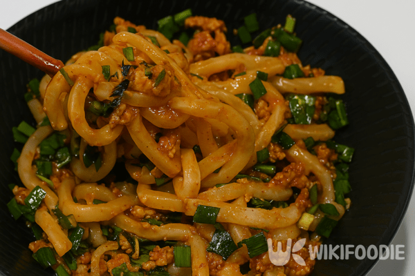 우동 면 1인분, 다진 돼지고기 150g, 다진 마늘 1스푼, 식용유 2스푼, 물 90ml, 고추장 1/2스푼, 굴 소스 1/2스푼, 고춧가루 1/2스푼, 설탕 1/2스푼, 치킨스톡 소량, 참기름 1스푼, 부추 10줄기, 대파 1/2대, 김 가루 2스푼, 새우깡 1줌, 달걀노른자 1개