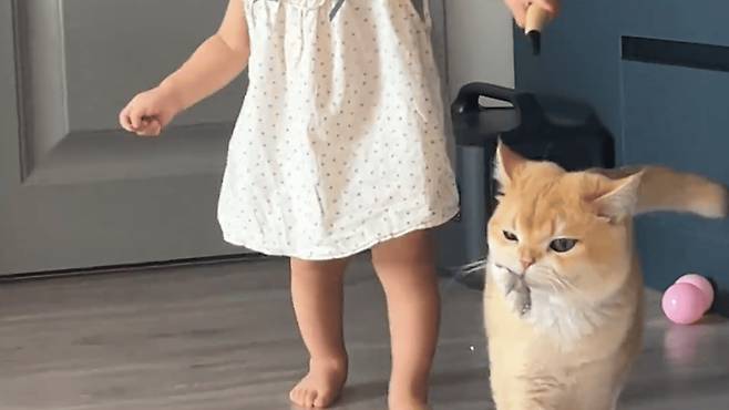 고양이는 재빠르게 "쓩" 소리와 함께 캐비닛에서 뛰어내렸습니다. 더욱 놀라운 점은, 고양이가 장난감을 입에 물고 장난기 가득한 작은 안내자처럼 아이를 따라 천천히 엄마에게 걸어갔다는 것입니다.