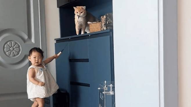 고양이는 캐비닛 위에서 우아하게 고개를 이리저리 돌리며, 가끔 발로 장난감을 건드리면서도 쉽게 내려오지 않았습니다. 그때, 멀리서 엄마가 아이를 불렀습니다. 놀랍게도 고양이는 그 소리를 정확히 알아듣는 듯했습니다.