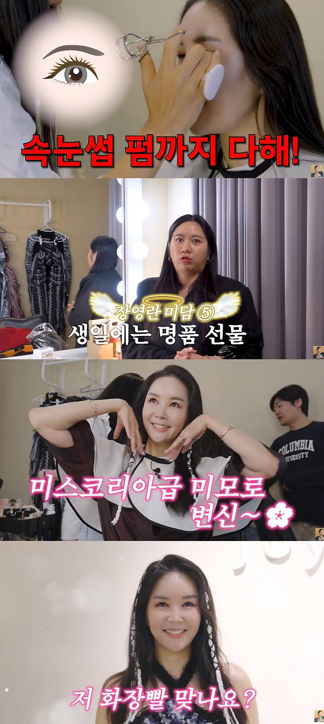 장영란은 "청담동에서 피부화장 받으면 안무너져내리잖아. 그 비결 오늘 다 밝혀달라"며 담당 메이크업 실장에게 꿀팁을 요구했다.