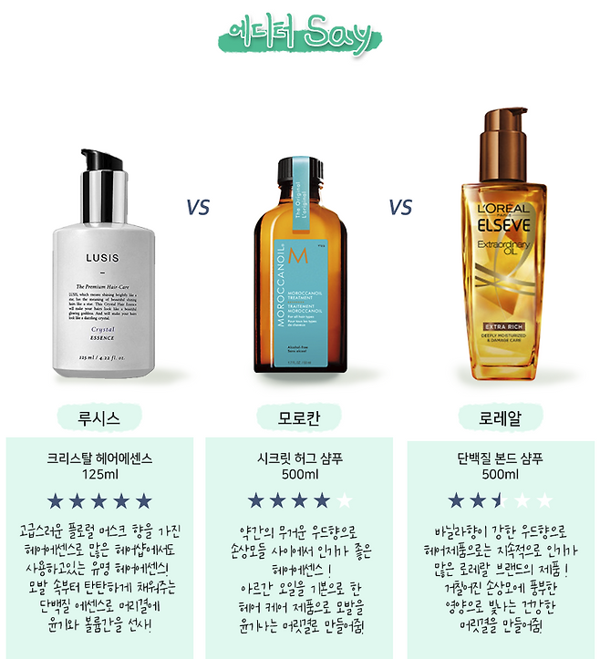 다른 모로칸 헤어 에센스와 로레알 헤어 에센스 역시 순위를 다투는 제품들로 각자 개취에 맞게끔 선택해서 사용해 보길 추천한다!