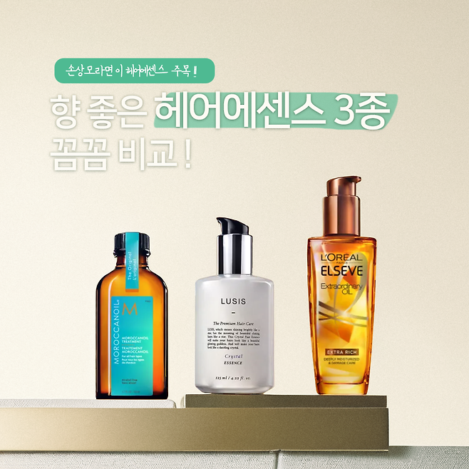하나씩 비교하기 앞서 오늘 선보일 헤어 에센스 리스트를 먼저 소개한다. 손상된 모발에 생기를 불어 넣어주고, 향도 좋은 헤어 에센스로 집에서도 쉽게 건강한 머릿결을 만들어주는 강력한 제품들이니 손상모라면 이 헤어 에센스들을 주목!