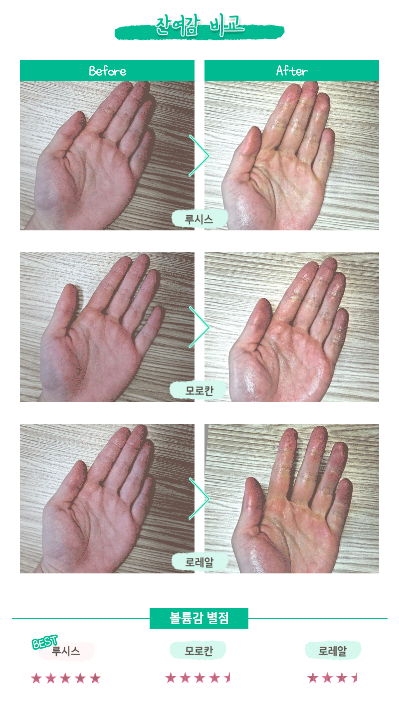 루시스 헤어 에센스는 라이트 한 제형이 모발 깊숙이 침투되어서 그런지 손에 잔여감이 느껴지지 않아 더욱 만족스러웠다. 잔여감이 적어 평소에 가지고 다니면서 사용하기도 좋은 제품이다.