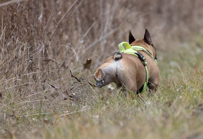 산책하다 말고 땅에 뒹굴거나 몸을 비비는 강아지들도 있어요. 이는 강아지 본능에 따라 다른 냄새를 묻혀 자신을 숨기려는 의도가 있을 수 있다고 합니다.
